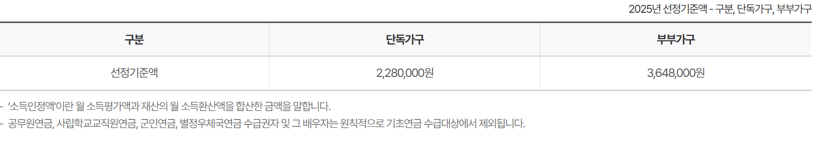 🔍 소득인정액 기준 (2025년 예상) 기초연금은 소득인정액에 따라 수급 여부가 결정됩니다.